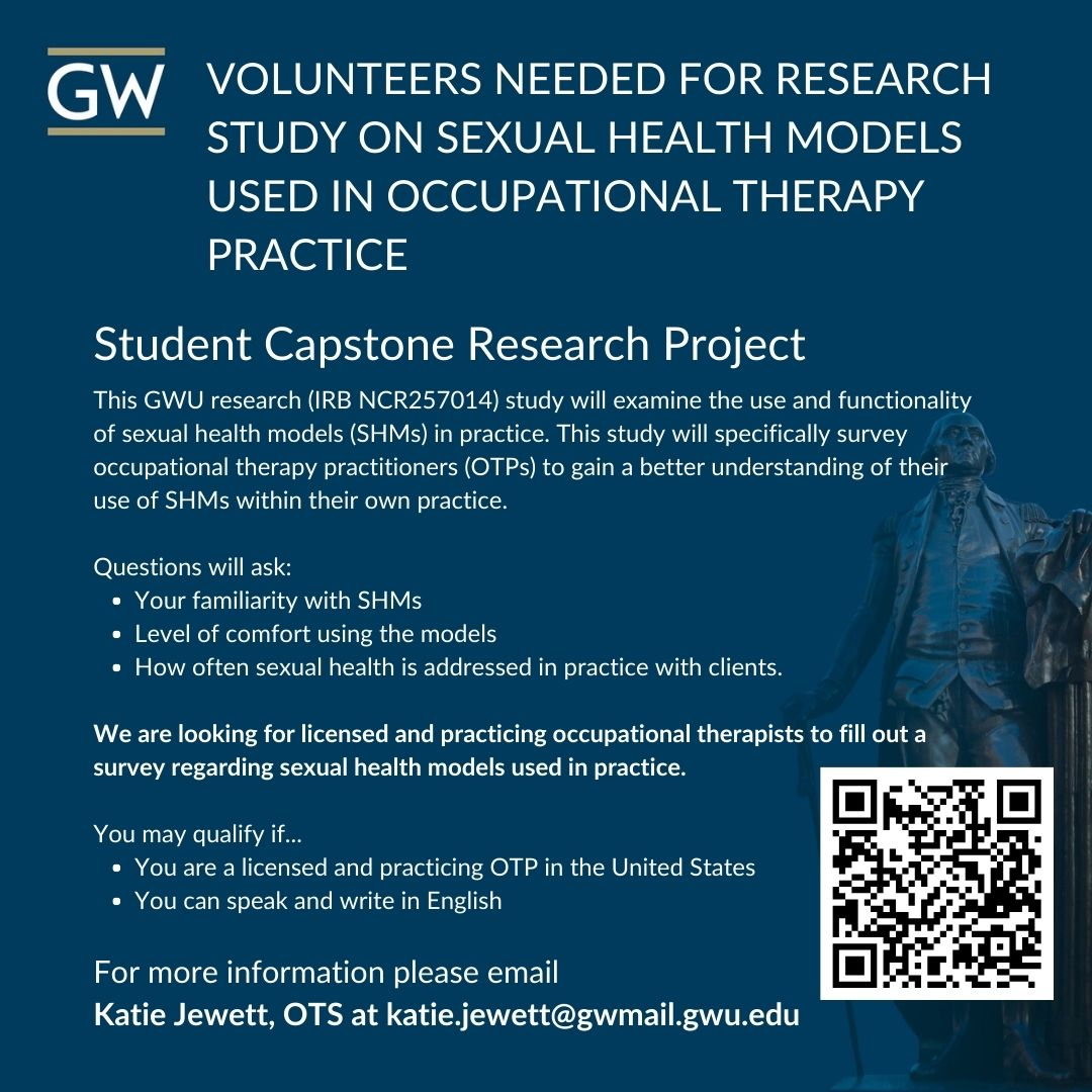 The impact of menopause-related symptoms on Occupational PerformanceAre you an occupational therapist practicing in Georgia? We’re inviting OTs to participate in a brief survey exploring how menopause-related symptoms may impact clients' occupational performance—and how OT can help.Your responses will help assess the current landscape of OT’s role in menopause care and inform the development of clinical tools for both practitioners and clients. Who: Licensed occupational therapistsTime commitment: ~5-10 minutes Survey link: https://gsu.qualtrics.com/jfe/form/SV_d551jHRRqQumerk Optional: Provide your email to receive the clinical resource and follow-up survey in the coming months. If you have any questions, feel free to reach out to Dara Fuller at [email protected] or Dr. Emily Buchman at [email protected]. Thank you for supporting this doctoral capstone project!